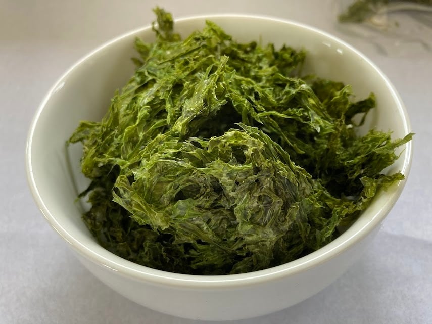 海苔がフレーク状ですが焼いてあります、海苔自体は養殖ですが板のりより作業工程で水洗いが少なく磯の風味が強いのが特徴です
